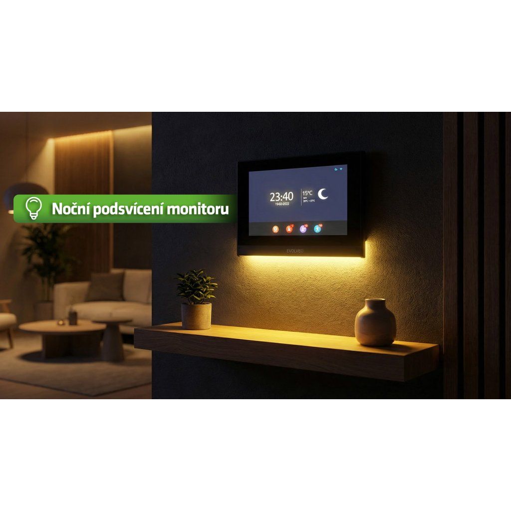 DoorPhone ID1 není jen technické zařízení, ale i designový prvek interiéru. Monitor je doplněn jemným oranžovým downlight podsvícením na spodní straně, které funguje jako tlumené orientační světlo. V noci, když jdete pro vodu nebo kontrolujete děti, nemusíte rozsvěcet hlavní světlo v chodbě. Jemná teplá záře vytvoří příjemnou atmosféru a zároveň vás bezpečně navede. Je to detail, který možná na první pohled nevypadá zásadně – ale v každodenním provozu jej oceníte opakovaně.
