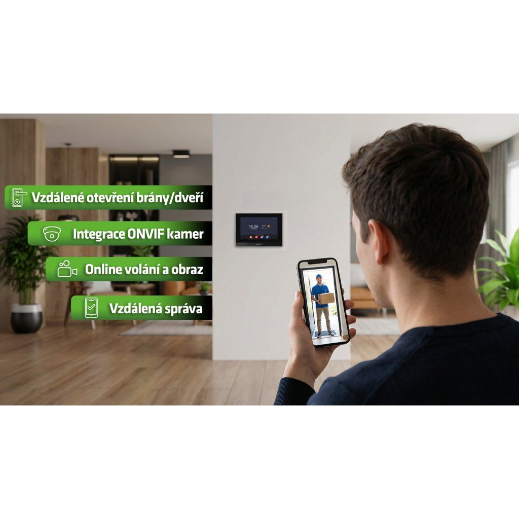 Systém zároveň podporuje integraci ONVIF IP kamer. Monitor tak může zobrazovat nejen obraz z venkovní jednotky, ale i z dalších bezpečnostních kamer, například z prostoru u brány, příjezdu na pozemek nebo zadního vstupu. V praxi tak funguje jako centrální obrazový bod domu nebo menšího objektu. Při zazvonění vidíte vstup, během chvíle se přepnete na kameru u brány a máte kompletní přehled o situaci.