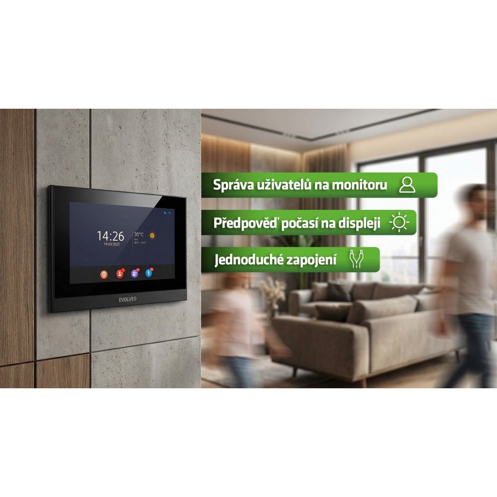 Monitor může zároveň sloužit jako digitální fotorámeček. V pohotovostním režimu zobrazuje fotografie uložené na microSD kartě a přirozeně tak zapadne do interiéru. Nepůsobí jako technický panel, ale jako součást domácnosti. Rozhraní je přehledné a intuitivní, správa uživatelů i přístupových práv probíhá přímo na displeji během několika kroků.