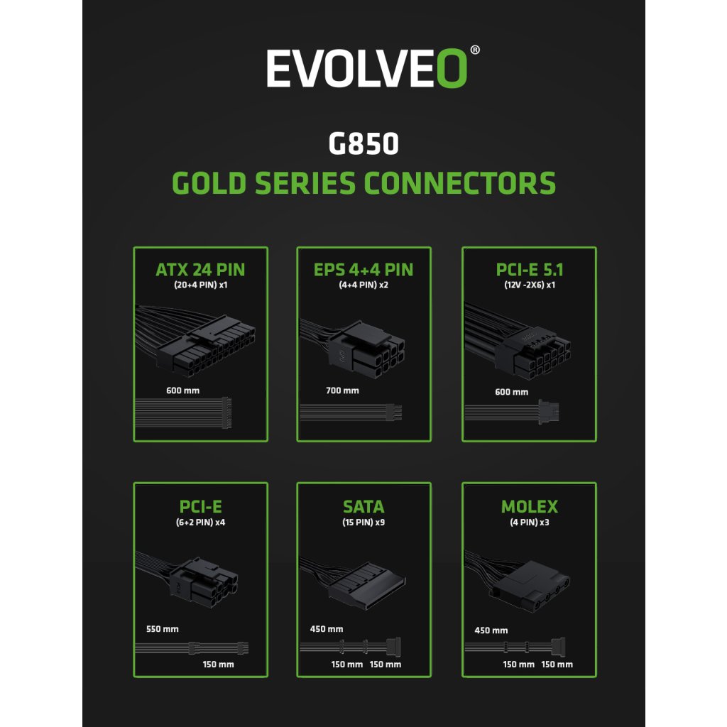 Zapomeňte na zamotané kabely, které brání proudění vzduchu a ještě vaší počítačové skříni kazí styl. Zdroj EVOLVEO G850-WH je plně modulární, takže k němu připojíte jen ty kabely, které opravdu potřebujete. Součástí balení jsou všechny důležité šňůry – jeden kabel ATX 24 PIN, dva EPS 4+4 PIN, dva PCI-E 6+2 PIN, jeden PCI-E 5.1 12V-2×6, tři SATA a jeden MOLEX. Díky tomu máte místo na vše od CPU a GPU přes disky až po vymazlené LED pásky či jiné extra prvky.