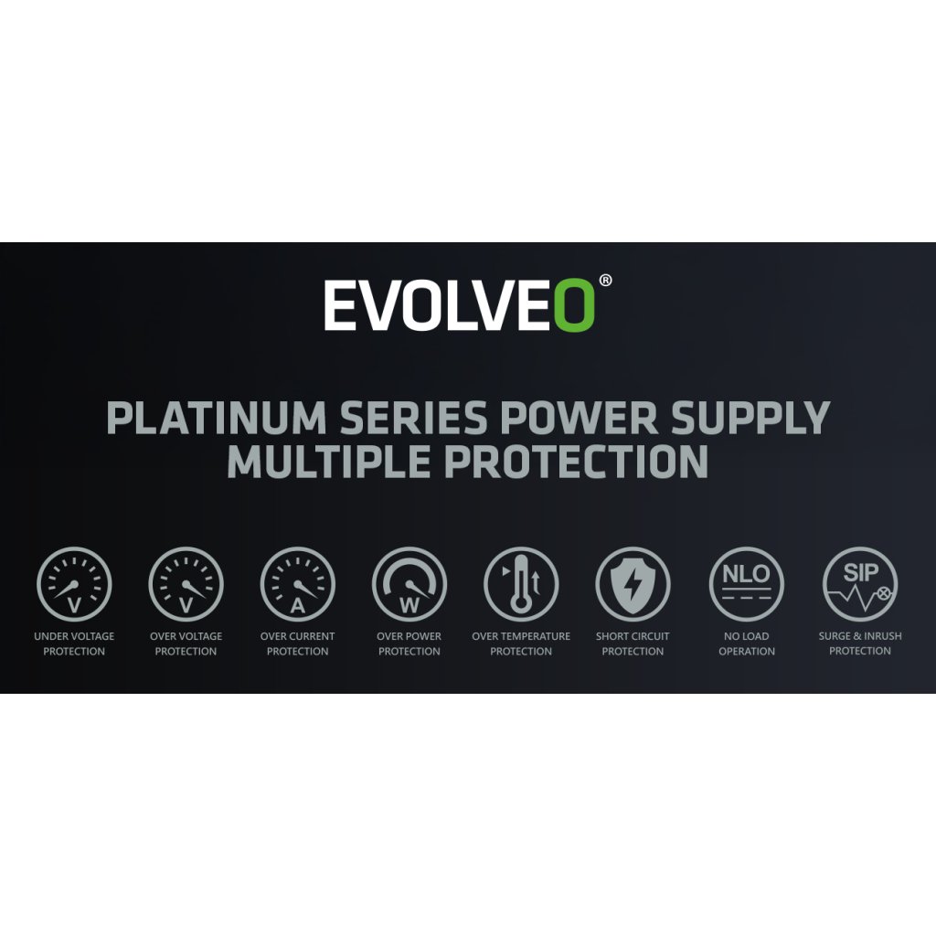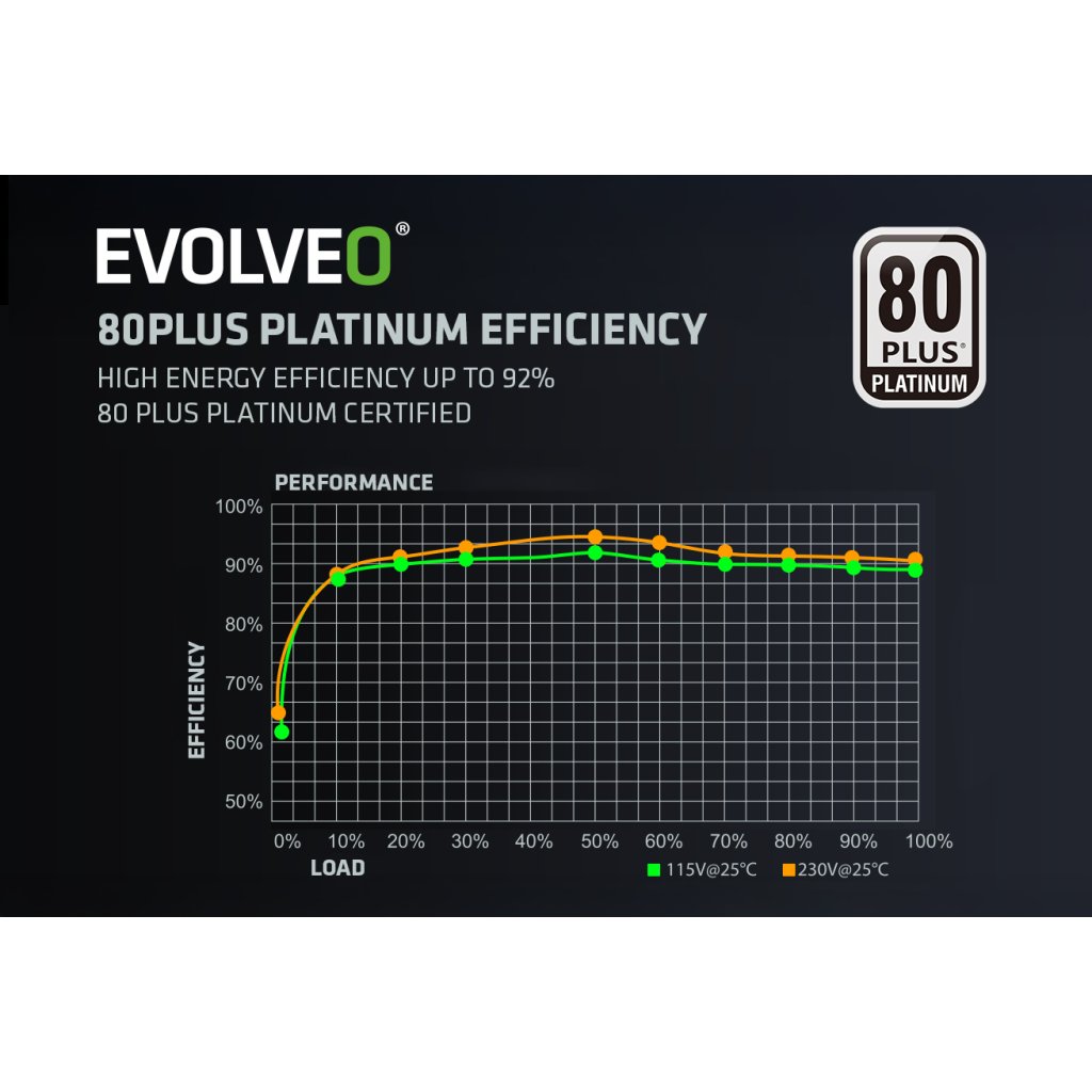 PC zdroj EVOLVEO P1200-BK je hrdým držitelem certifikace 80 PLUS Platinum, která slibuje až 94% účinnost (při běžném 50% zatížení). Minimální ztráty energie a nízké zahřívání jdou přitom ruku v ruce s tichým chodem 140mm HDB ventilátoru – ten má mezi hřídelí a ložisky speciální olejovou vrstvu a jeho tření je nepatrné, takže hlučnost zůstává na minimu. S tímto zdrojem vás zkrátka hučení ventilátoru neruší – slyšet je jen svištění kol vaší formule nebo řinčení zbraní vaší armády.